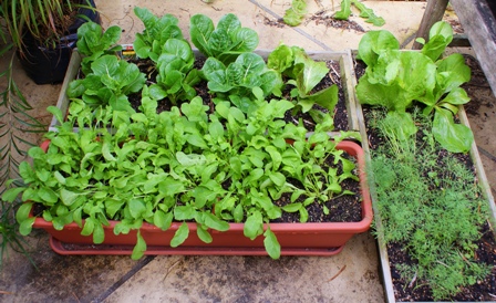 | Lettuces and herbs in troughs |
